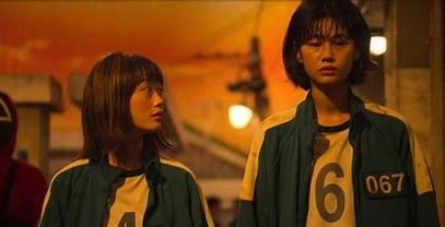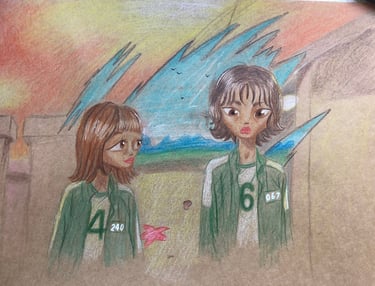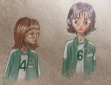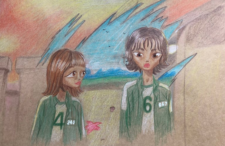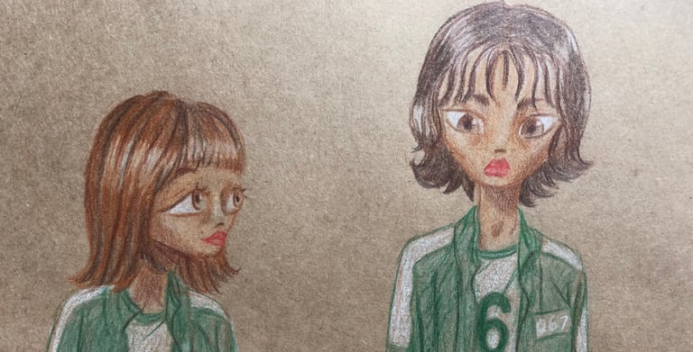 Colored pencil representation of 240 and 067 from the Netflix series Squid game.